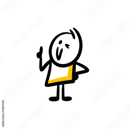 The sly playful character winks at us with his eye and points up with his finger.