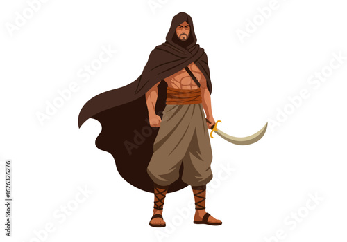 Desert Warrior cloaked figure armed with scimitar poised for action