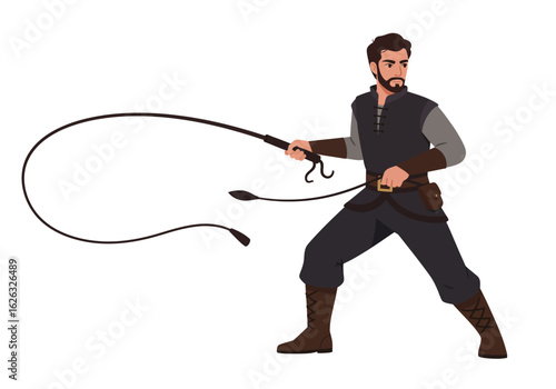 Bearded adventurer wields a whip ready for action