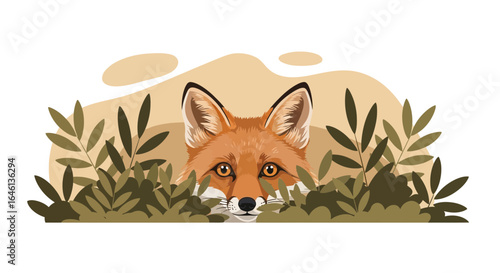 Illustration of a sly fox peering out from behind foliage in a muted color palette reminiscent of autumn