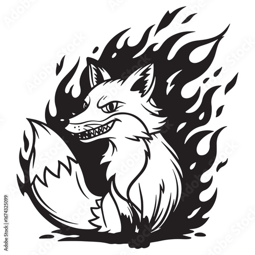 Fiery Fox Silhouette A dynamic monochrome illustration featuring a cunning fox engulfed in flames, perfect for logos, designs, and creative projects