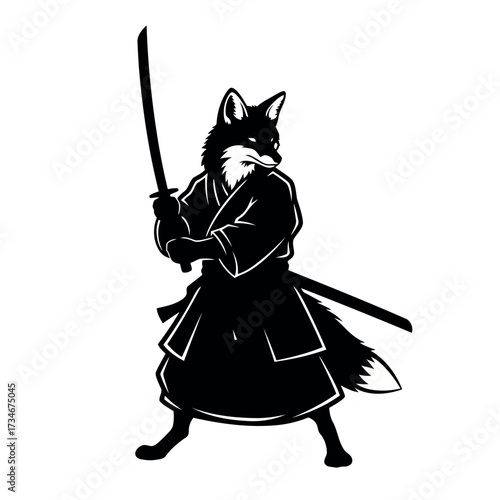 Transparent background also white background Black silhouette of a fox warrior in traditional Japanese samurai attire holding a katana sword vector