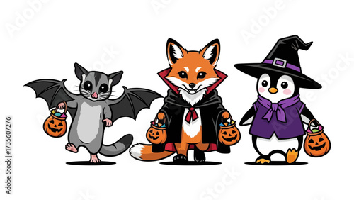 Halloween Crew's Treat Adventure: A trio of charming animal characters dons their spookiest Halloween costumes and proudly hold their candy pumpkins. An adorable sugar glider, a cunning fox.