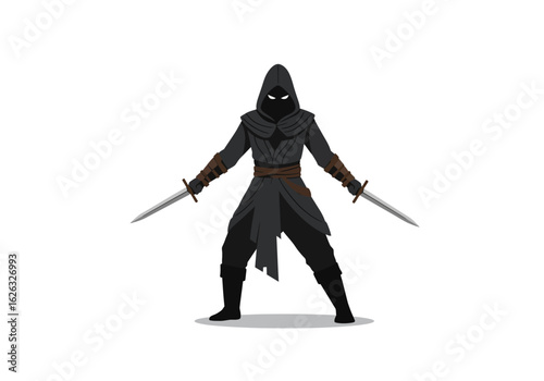 Hooded assassin with daggers poised for action Shadowy figure