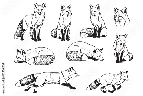 A set of black and white vector illustrations of a fox in various poses. wild animals.