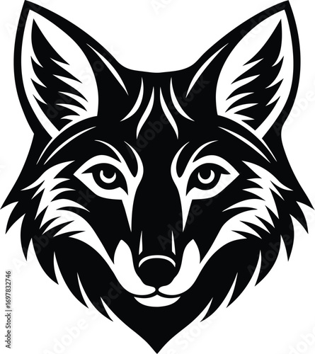 Vector art of striking black and white graphic illustration of a foxs head, with sharp lines and detailed fur texture, conveying a sense of wildness and intelligence, isolated on a