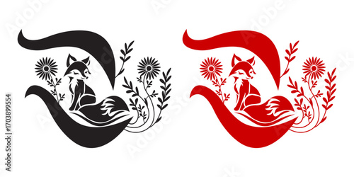 Stylized fox silhouette with curving tail and floral motifs, in black and red versions, symbolizing cunning nature and mystical elegance for logos or decor.