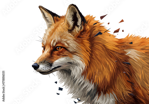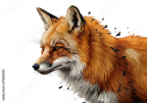 Detailed Digital Illustration of a Red Fox with Shattering Fur Effect.