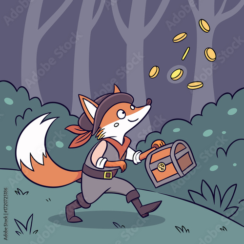 Vector art of a cunning fox pirate, dressed in a stylish hat and vest, joyfully runs through the moonlit forest with a treasure chest, scattering gold coins as he goes, creating a magical scene