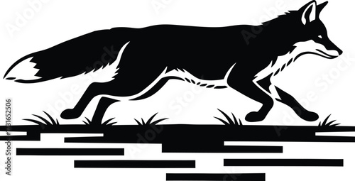 Detailed silhouette of a cunning wild fox running across the grassy field, forest animal predator black and white vector illustration.