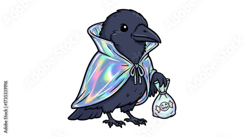 Mysterious Crow in Cape: A cunning cartoon crow is seen adorned with a shiny cape. The crow's charming presence is enhanced by the cartoonish, yet realistic touches of the image.