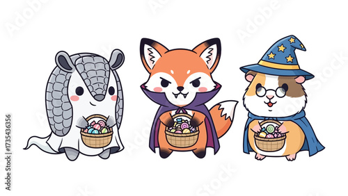 Whimsical Halloween Animals with Basket: Three cartoon animals, a friendly armadillo in a ghost costume, a cunning fox dressed as a vampire, and a wise guinea pig in a wizard's hat.