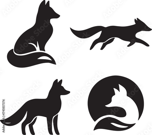 Collection of elegant black fox silhouettes featuring sitting standing running and circular logo designs ideal for branding and wildlife themes