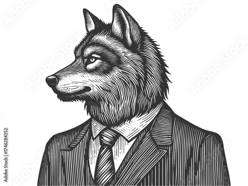 wolf with a human body in a suit, symbolizing strength, leadership, cunning, and surreal creativity sketch engraving generative ai vector illustration. Scratch board imitation. Black and white image.