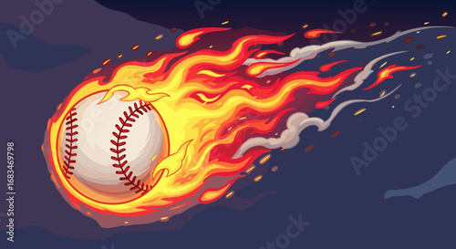 Baseball on fire flaming fastball effect, showing power, speed, and strength with explosive motion, energetic athlete performance, and dynamic sports theme illustration.