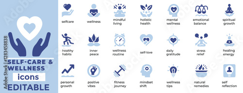 Health and wellness, linear style: stretch bands, self-care face mask, herbal tea mug, body scan figure, posture check, foam roller, rest and recovery icon, yoga blocks.