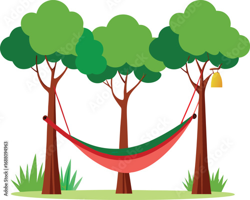 Summer rest of boy sitting in hanging green hammock, front view. Young barefoot man resting in fabric swing bed and watching, recreation of person in garden camping cartoon vector illustration