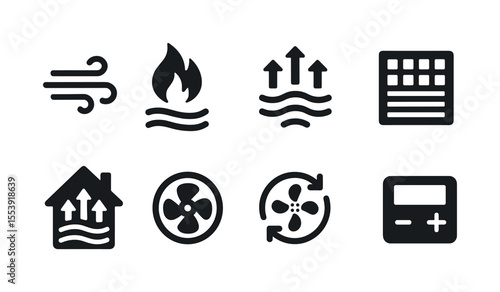 Hvac and airflow symbols set – solid style heating, ventilation, cooling icons for building design: fan, duct, filter, thermostat, pipe, exhaust hood, blower.