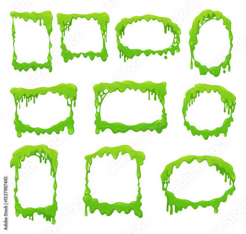 Frames of liquid green slime flows, dripping poison goo. Vector cartoon set of borders different shapes from fluid mucus drops and sticky ooze splatters isolated on white background