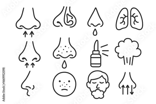 Nasal Health Icons. Hand-drawn doodle illustration nasal conditions inflamed nose, blocked nasal passage, sinus icon, mucus drop,