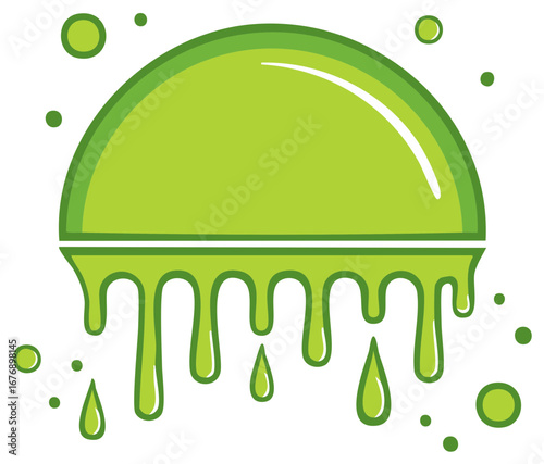 Green slime drip with 3D goo effects and toxic splatter textures. Realistic liquid splashes for Halloween zombie or radioactive designs. Transparent droplets or sticky mucus elements for banners.