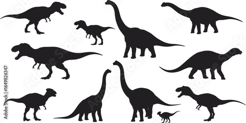 Dinosaur silhouettes, prehistoric vector icons, black graphic reptiles, extinct species illustration, educational design, Jurassic creatures, fossil reference elements
