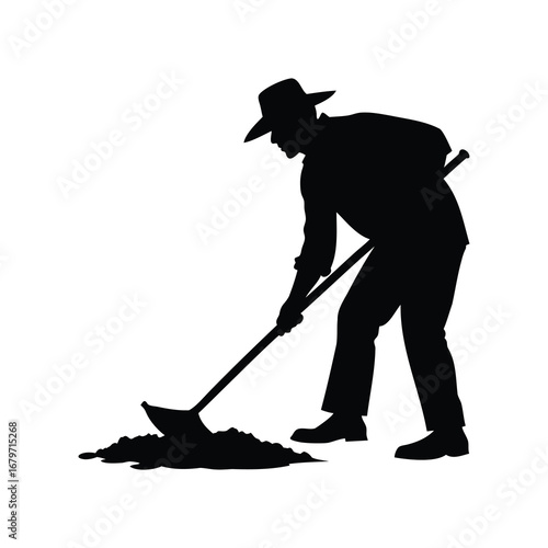 Silhouette of a farmer in a hat holding a pitchfork with a black and white background illustration