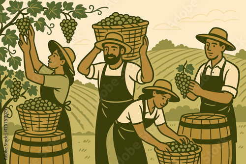Colorful Minimalist Line Art of Farmers Celebrating Harvest with Baskets of Grains and Fruits – Abundance, Community, and Culture Illustration