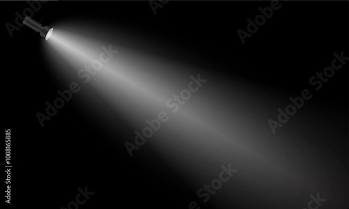 Flashlight projecting wide luminous beam on wall with realistic light scatter effect on dark background. Realistic black metallic torch creating soft gradient illumination with transparent glow.