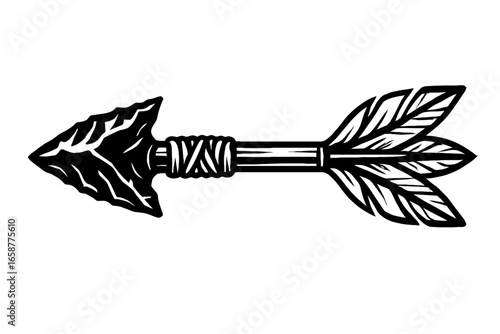 Classic arrow illustration with geometric tip and detailed feather fletching hand drawn monochrome  design
