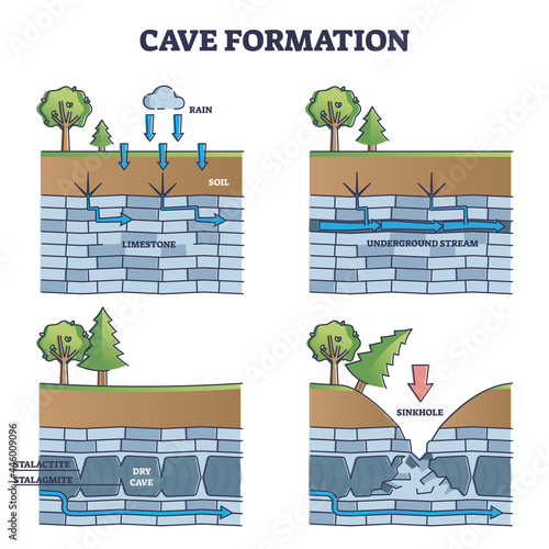 Cave exploration icons set featuring stalactites, stalagmites, crystals, and helmets