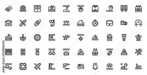 Water Sports icon set. Vector illustration. Includessymbols for swimming, divig, kayak, surf, sailboat, ifesaver, snorkeling and mre. Editable stroke.