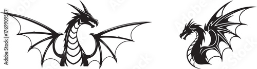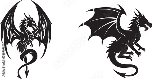 Black Vector Dragon Silhouettes with Spread Wings on White Background