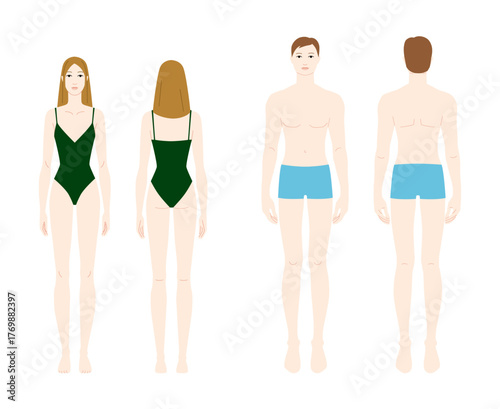 Male and female body template front and back view, Porcelain Fair skin tone diversity man, woman. Flat vector anatomy model for fashion design tailoring, garment fitting, body proportions, measurement