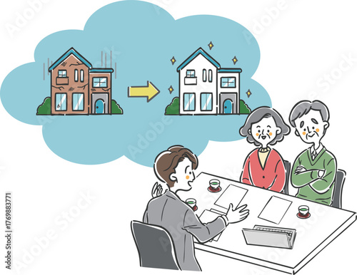 男性スタッフからリフォームに関する説明を受けるシニア夫婦 ベクター