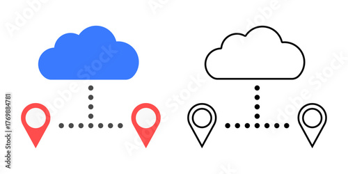 Latency tracker node icon featuring interconnected cloud and map pins with dotted delay lines. Ideal for cloud performance analytics, network monitoring, and distributed system visualization.