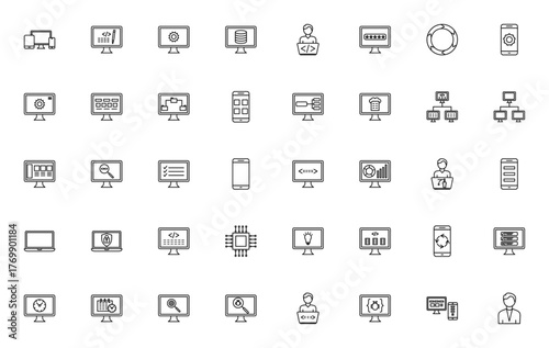 Computer Programming icon set. Vector illustration. ncludes symbols for code, pp development, database, X/UI design, debugging, clud coding, project managemnt and more. Editable stroe.
