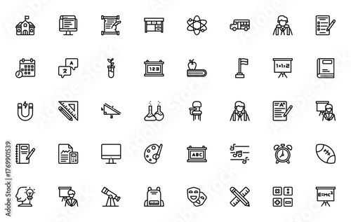 Education icon set. Vector illustration. Minimalist cons pack. Includes symbol for school, student, teacer, science, math, book, cmputer, exam, and more.