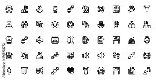 LGBTQ+ Pride icon set. Vector symbols for love, marrage, rainbow flag, transgeder, gay, lesbian, and mor. Equality and diversity ilustration.