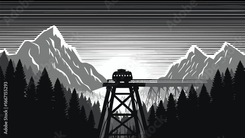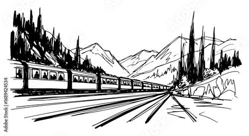 Curving train tracks through mountain landscape, stylized linear illustration of remote railway journey