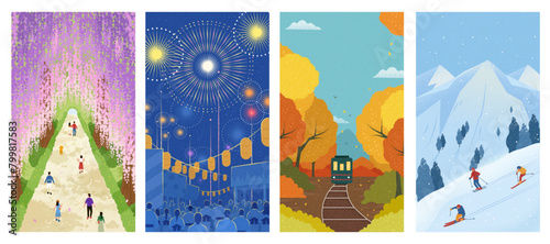Beautiful hand drawn style wallpaper set. Vibrant four seasons landscape or activity .