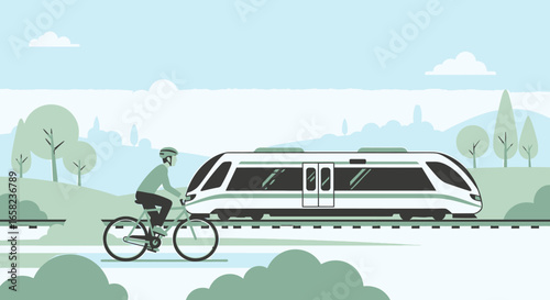 A white train crosses a bridge near a mountain flat illustration. It is ideal for website banners, travel posters, transportation themes, and scenic railway marketing materials.
