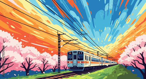 Enchanting railroad journey through a serene landscape of cherry blossoms in spring