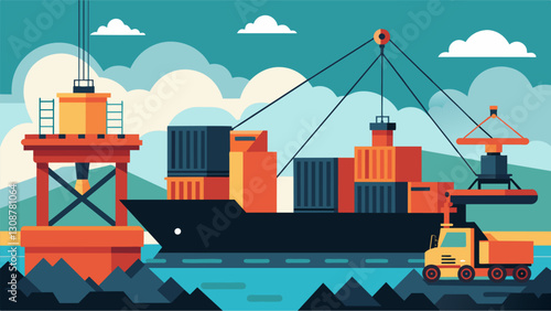 Tugboat pulling a large cargo ship in the sea isolated on white backround