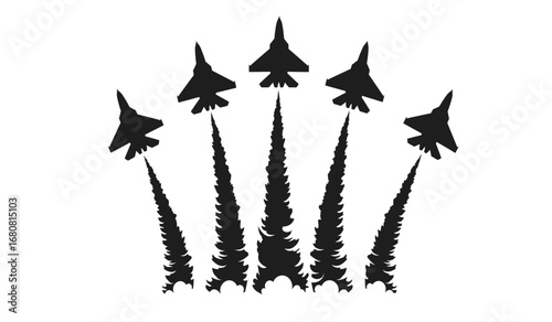 Silhouette of five fighter jets flying in formation, military aircraft, aviation, defense, air force, combat jets, aerial maneuver, tactical flying, high speed, squadron flight