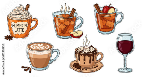 Autumn drinks set. Hot pumpkin latte, tea and coffee with spices, cocoa with marshmallow. Seasonal fall and winter beverages in cup, mug, glass. Flat vector illustrations isolated on white background.