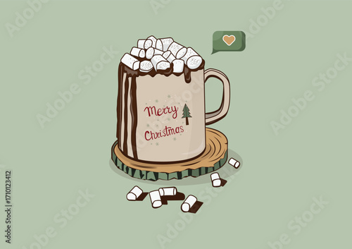 cute Christmas cup with a hot drink and marshmallow