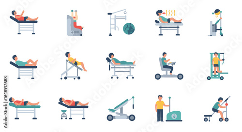 Rehabilitation Icon Sheet: An inclusive set of minimalistic icons representing various aspects of physical therapy, medical care, and well-being.