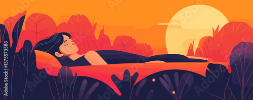 Peaceful sunset relaxation: woman lounging in nature with vibrant orange sky - vector.