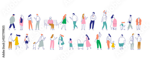 Line art people color bundle. Crowd. Hand drawn People vector set. Male and female flat characters isolated on white background.